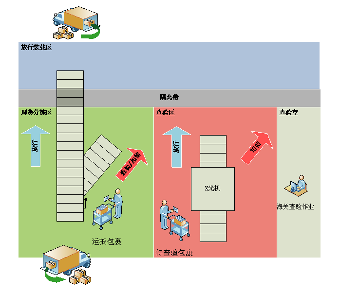 十一、通過自動傳輸分揀設備,連接裝卸、查驗、放行場地,其中放行貨物物品自動通過分揀設備進入放行裝載區。自動分揀設備預留接口,經海關允許可接收其他口岸管理部門的布控信息,提高分揀效能,降低建設成本。